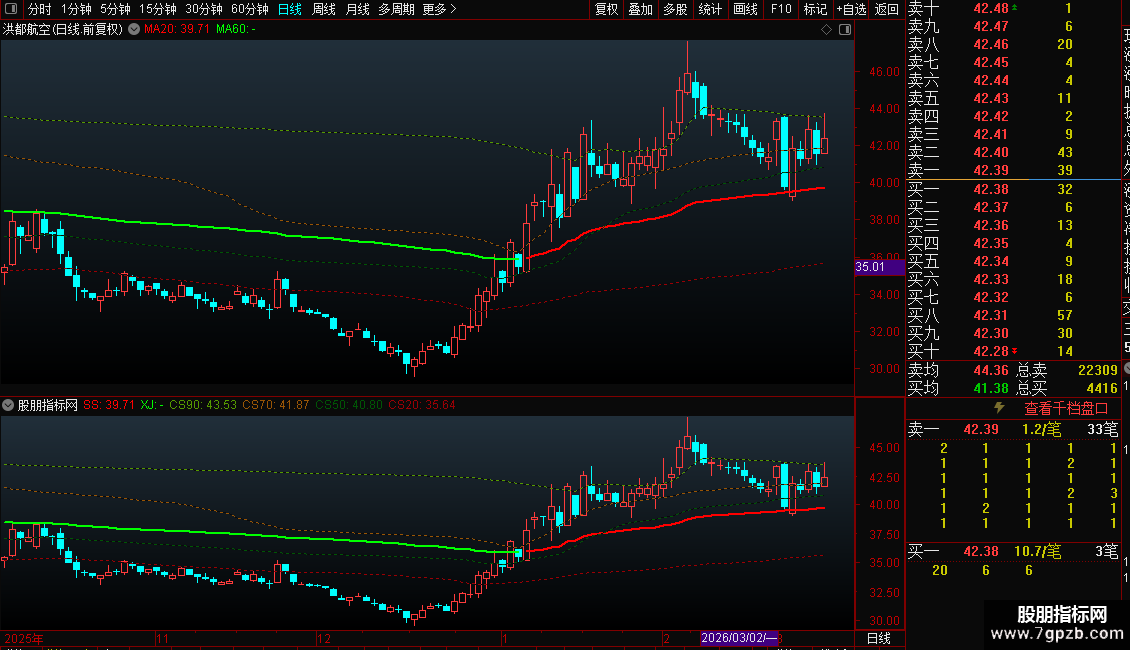 此主图由一根趋势线加四条定位线组成,红色粗线是上升趋势,绿色是下降趋势,可以看到比较强的支撑与压力,虚线是筹码成本线,可以看出筹码走向。如果需要看比较久的K线,需要设置不复权才会准确。