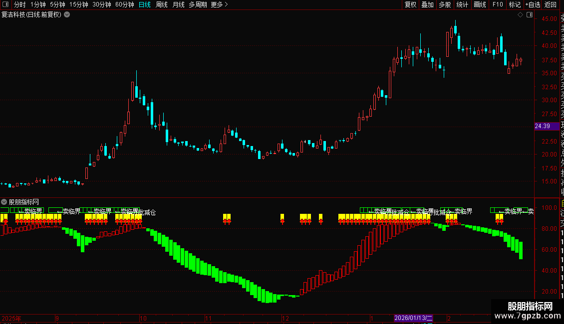 DRAWTEXT(EMA(V11,3)>60 AND EMA(V11,3)>REF(EMA(V11,3),1) AND REF(EMA(V11,3)>60 AND EMA(V11,3)>REF(EMA(V11,3),1),1)=0 AND REF(EMA(V11,3)>60 AND EMA(V11,3)>REF(EMA(V11,3),1),2)=0,96,' ←卖临界'),COLORFFFFFF;