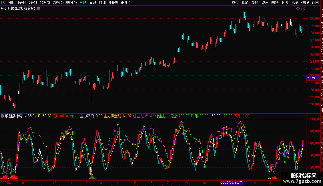 内有主力资金线,20以下低位,80以上拐头快跑。