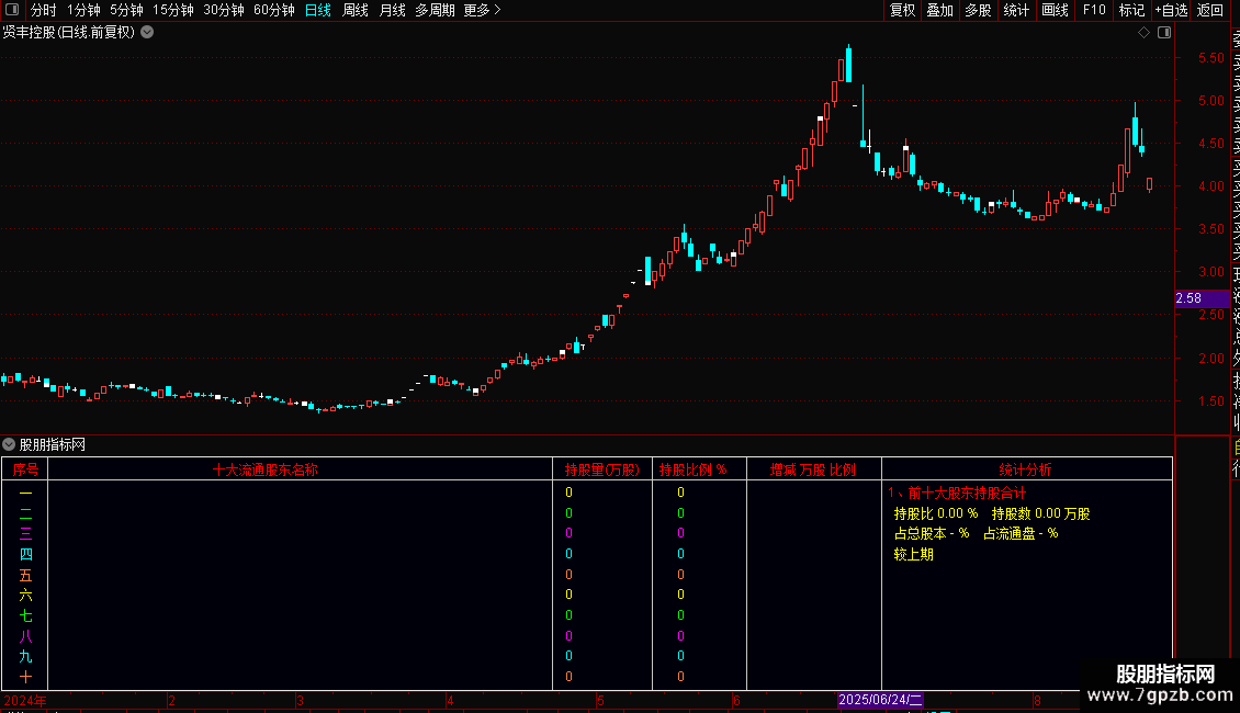 把以下源码做成指标幅图,可以直观展现最近六期机构家数持股数量及前十大流通股东持股合计,不需要自定义数据,只需要下载专业财务数据即可。