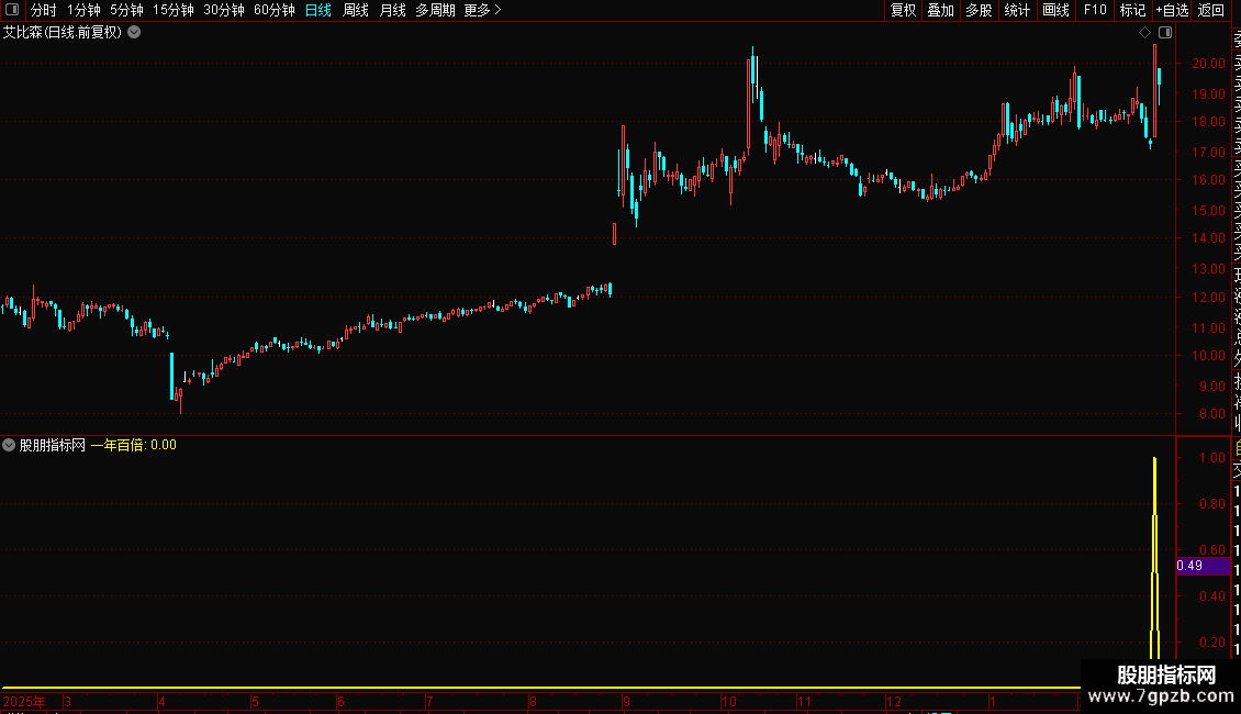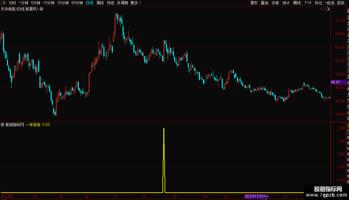 一年百倍:X_1 AND X_2 AND X_6 AND X_7 AND REF(CLOSE*1.11,1)<CLOSE,COLORYELLOW,LINETHICK2;