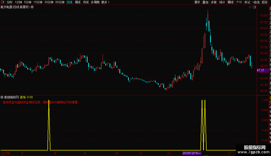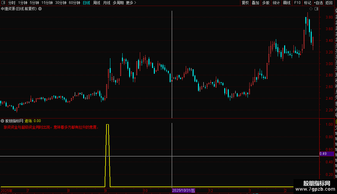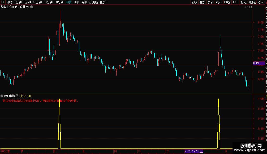 DRAWTEXT_FIX(1,0.01,0.01,0,'游资资金与超级资金同时出现,意味着多方都有拉升的意愿.'),COLORRED;