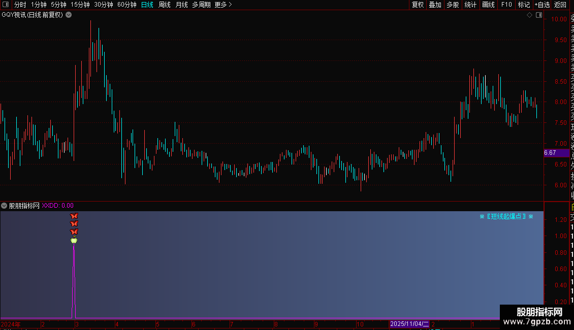 点7:=IF(CLOSE/REF(CLOSE,1)>1.050 AND HIGH/CLOSE<1.010 AND 点6>0, 91, 0);
