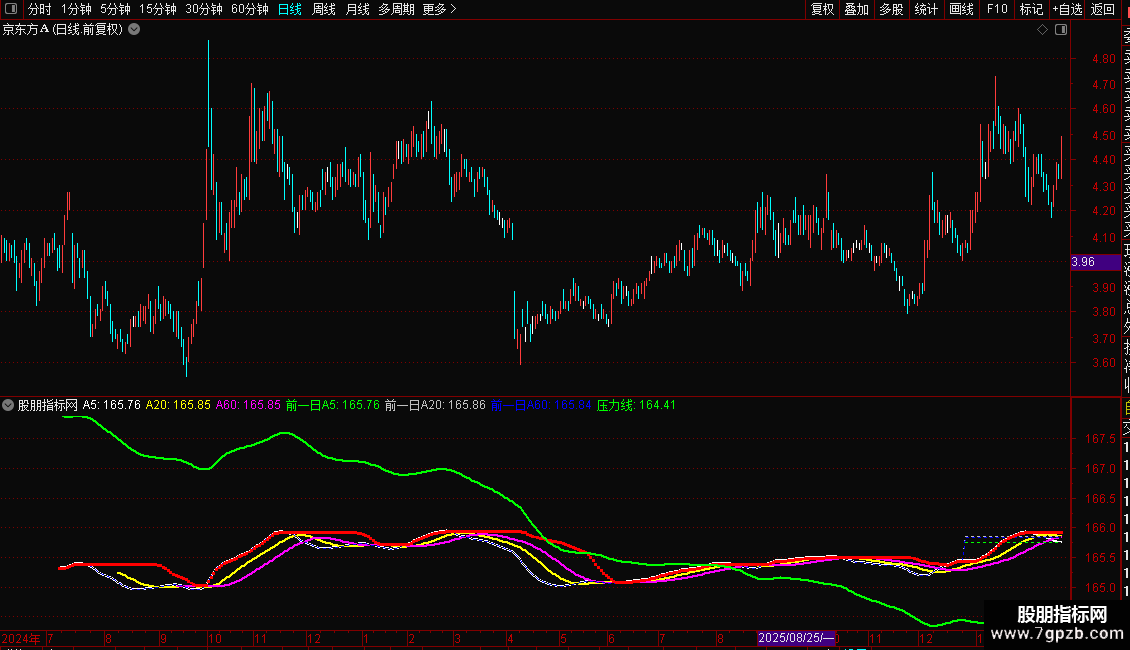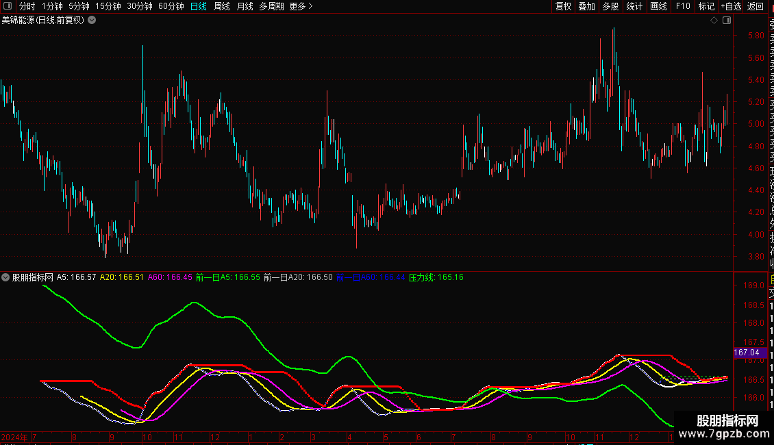 5,注意指标中前一日A5、前一日A20、前一日A60三条虚线随着股价的变化而变动,有时类似于缠论中的中枢却又有不同,当前一日A5、前一日A20、前一日A60多头排列时,股价趋势良好,当前一日A5逐渐下行,渐渐低于前一日A20、前一日A60时,注意变盘的风险。。。