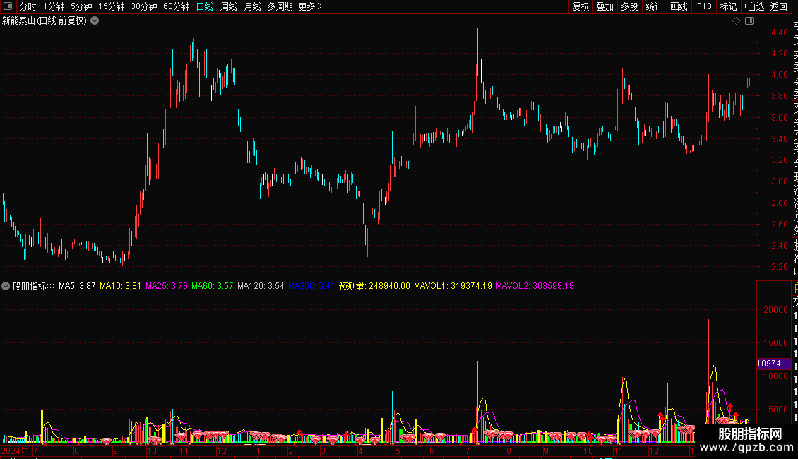预测量:IF(CURRBARSCOUNT=1 AND PERIOD=5,VOL*240/FROMOPEN,VOL),VOLSTICK;