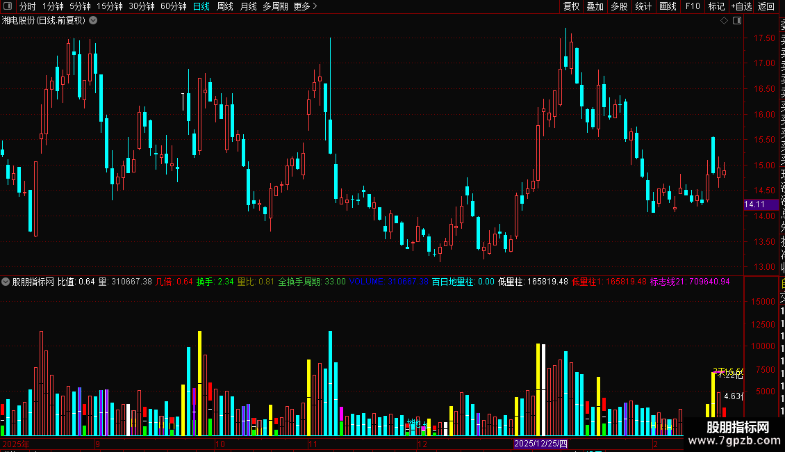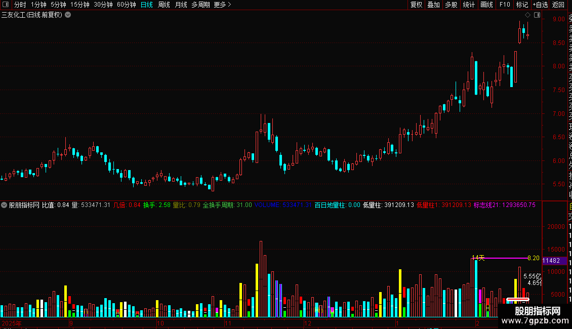 量比:VOL/REF(MA(VOL,5),1),NODRAW,COLORBROWN;