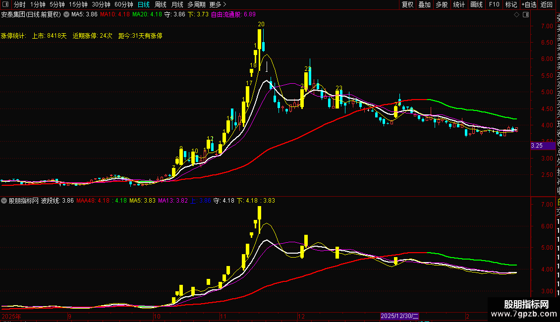 波段线:(MA(CLOSE,3)+MA(CLOSE,6)+MA(CLOSE,12)+MA(CLOSE,24))/4,COLORWHITE,LINETHICK2;