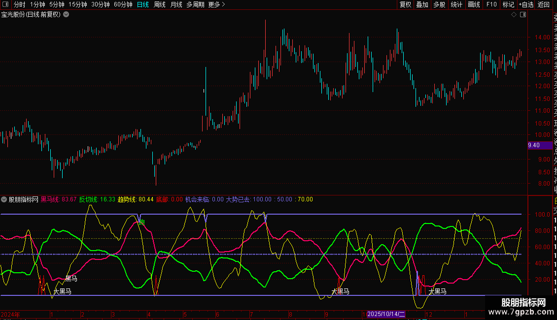 大势已去:IF(CROSS(黑马线,A1) AND 黑马线>70 AND 趋势线>80,90,100),LINETHICK2,COLORE66878;