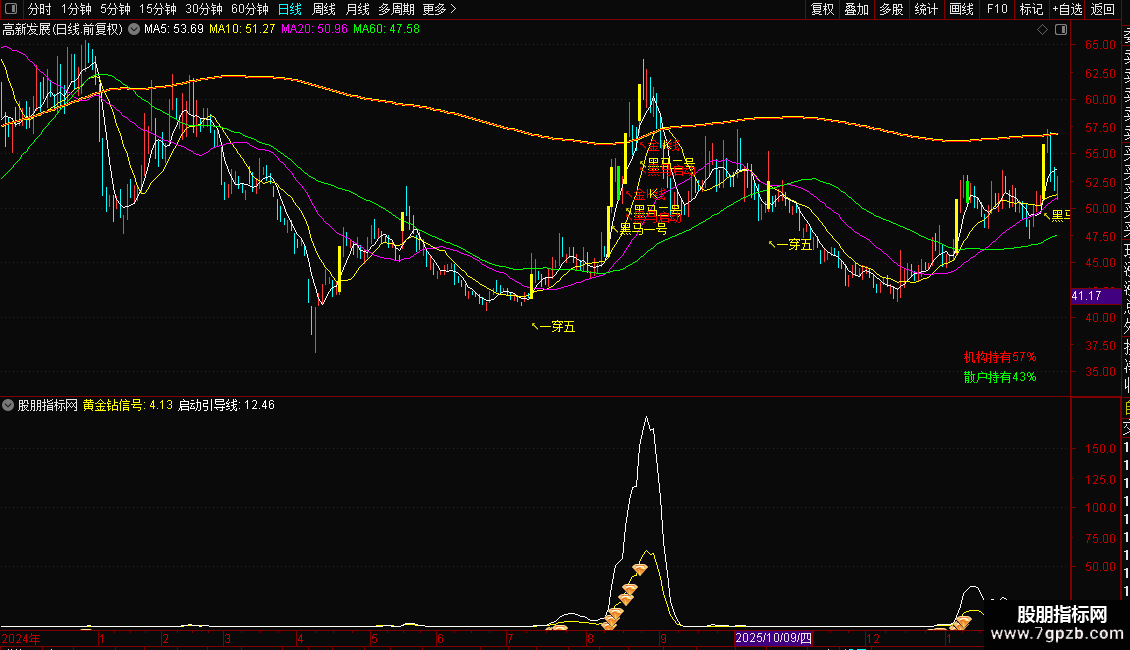 DRAWTEXT(选股,L*0.94,'↖一穿五'),COLORYELLOW;