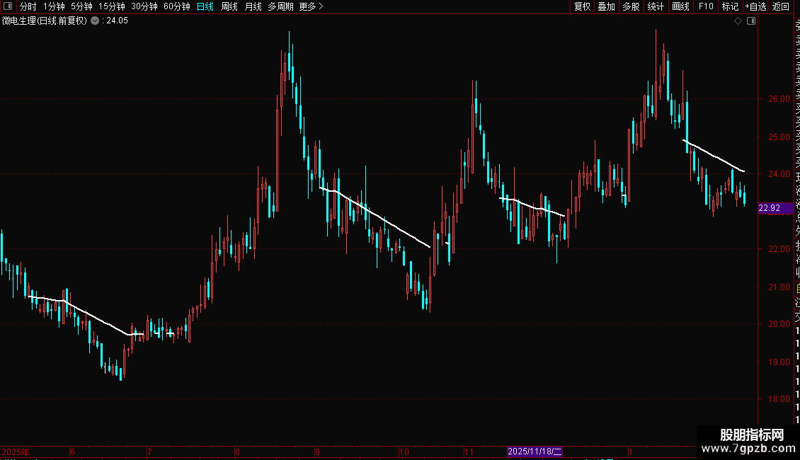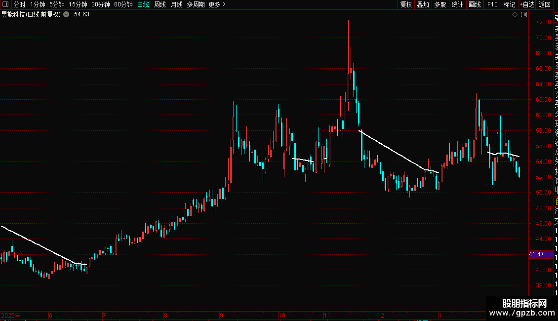 DRAWLINE(C>=趋势线,趋势线,C<趋势线,趋势线,0),COLORWHITE,LINETHICK2;