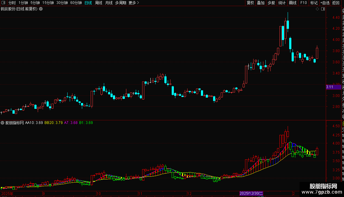3.股价站在30周均线上处于多头位置,量线呈现三线开花的态势;