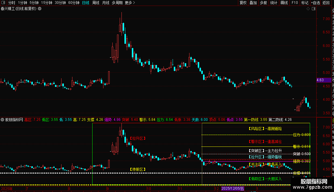 指标是一个基于价格区间划分的估值分析工具。它通过计算最近N周期(默认120日)的最高价和最低价,构建一个价格波动范围,并利用黄金分割比例将该范围划分为六个区域:低吸区、关注区、拉升区、突破区、警示区、风险区。
