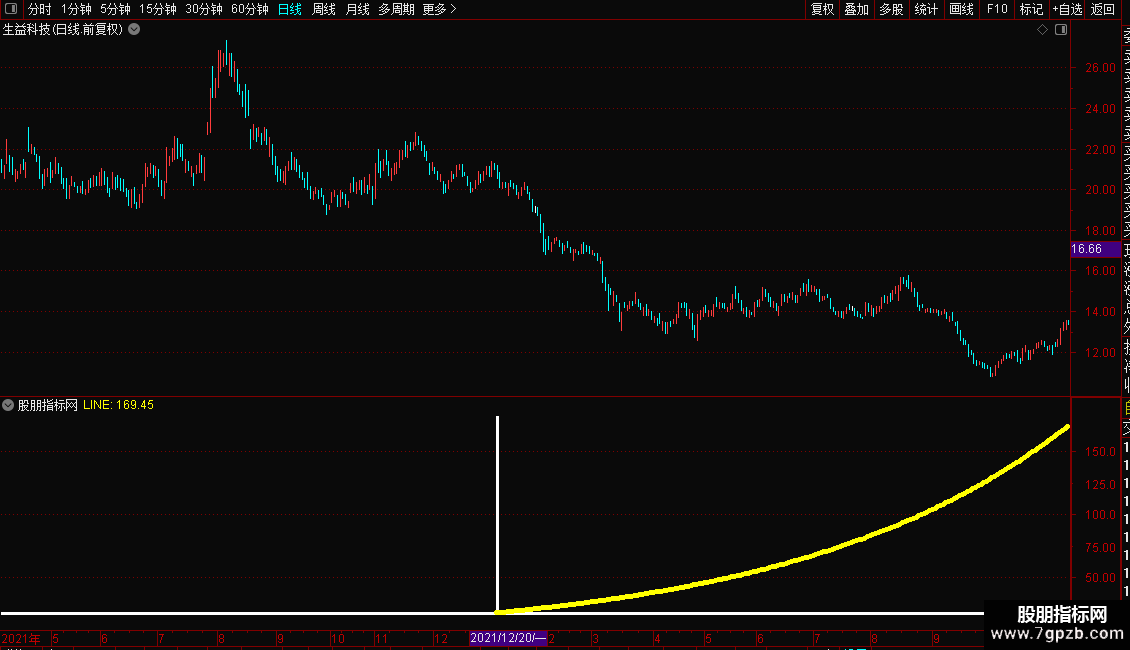 指标用于绘制一条每日增长1%的理论资金曲线,并与实际股价走势进行对比。