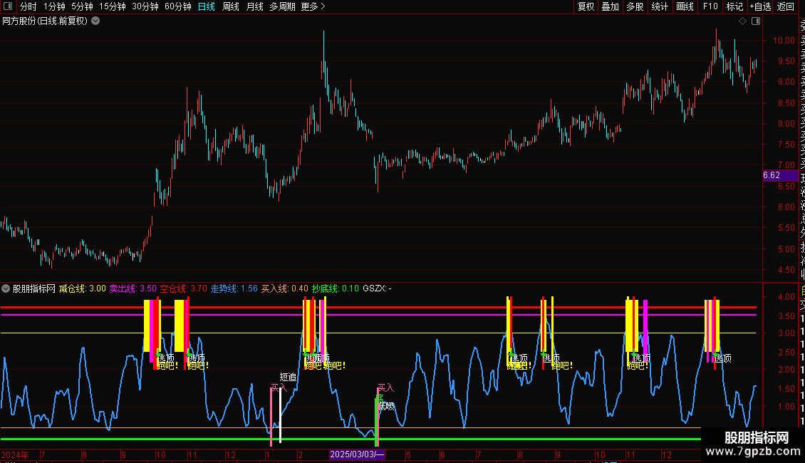 2. 结合文字与图标信号,在“抄底线/买入线”附近关注做多信号,在“减仓线/卖出线”以上注意风险信号。