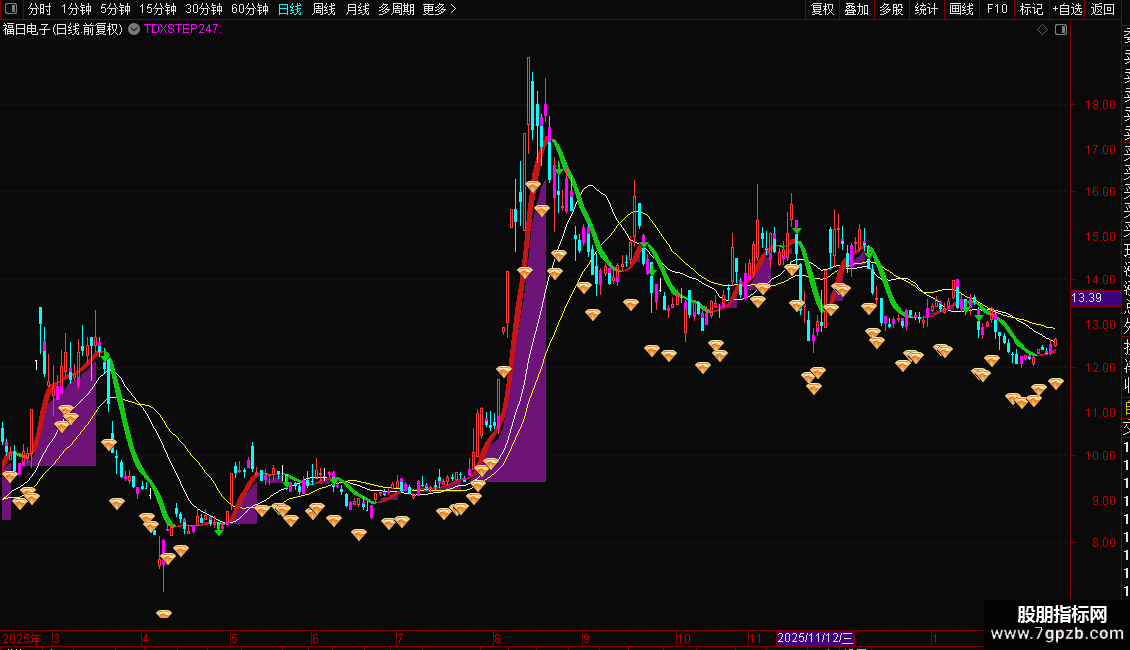 指标旨在通过价格均线、通道、动量指标、周期共振等多维度条件,筛选出符合“强势”、“超跌反弹”、“趋势启动”等特征的个股。图表上的各类图标和彩色标注用于快速定位符合这些复杂条件的K线位置,辅助交易决策。使用者应结合其他分析工具和风险控制手段综合判断。