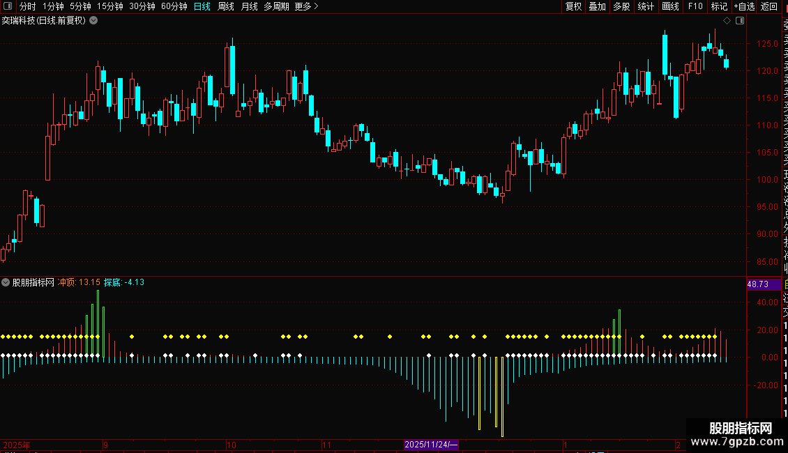 2. 探底:当数值降低(柱状图向下)时,表示股价接近近期(60周期)低点,存在反弹可能。黄色柱体提示超卖或探底信号。