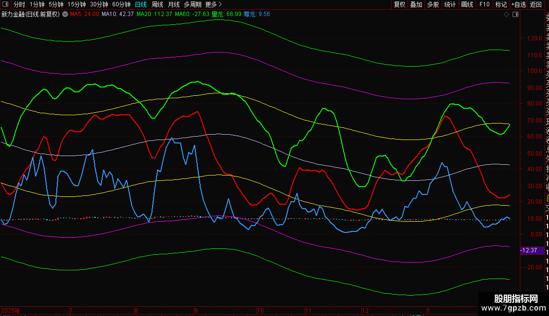- 量龙:成交量强度平滑线,反映成交量变化的相对强度。