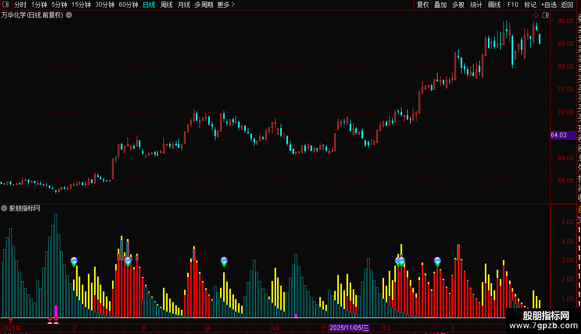 1. 多空动能柱:通过X、W、A、B等变量,以彩色柱状线在0轴上下分别展示短期与长期的多头、空头动能强度。