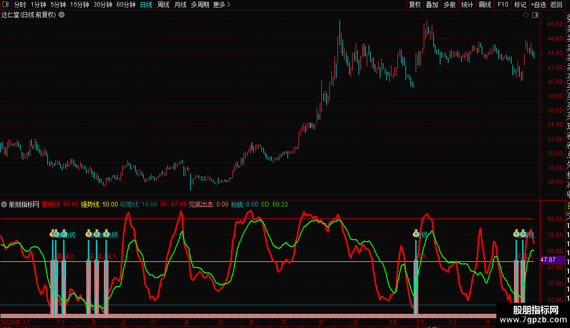 趋势判断:SK线在SD线上方为强势,下方为弱势。SK线从吸筹线附近上穿是关注点。