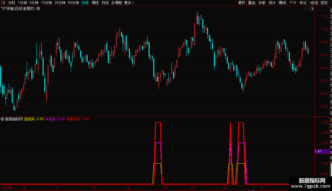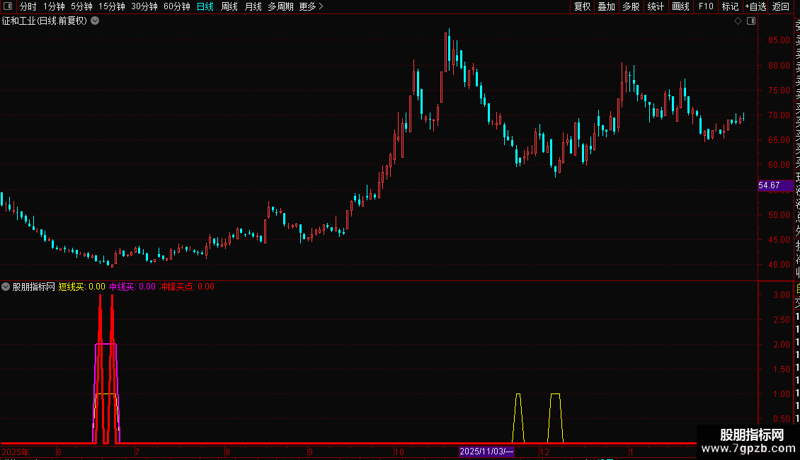 短线买(黄色细柱):信号强度最弱,提示短期机会。