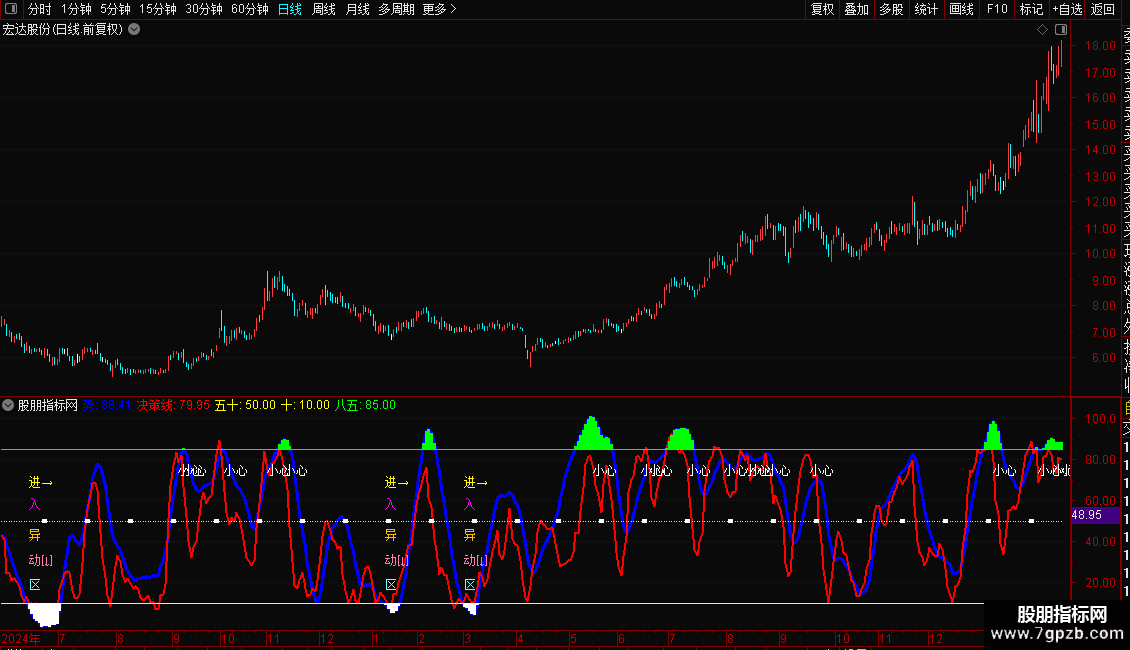 超买超卖提示:当“势”线进入85以上或10以下区域时,会以柱状线高亮显示,分别提示超买和超卖。