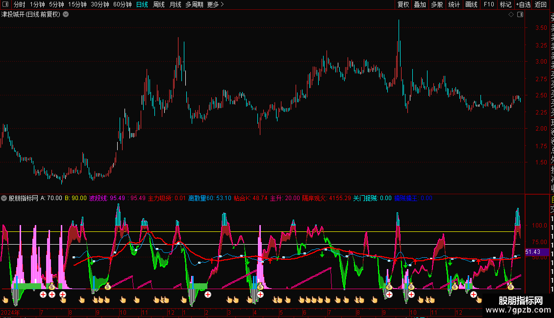 4、红箭头买进提示,绿箭头卖出提示。钱带子、红十字是买进提示。向上的手指是短线买进提示,一般持股3-5天。