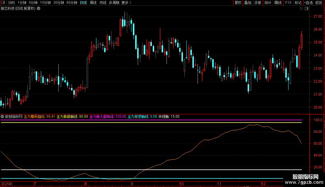 当满足条件VARD时,在VAR4和主力筹码趋向位置之间画柱状线,宽度为1,0不为0则画空心柱.,COLOR0099FF