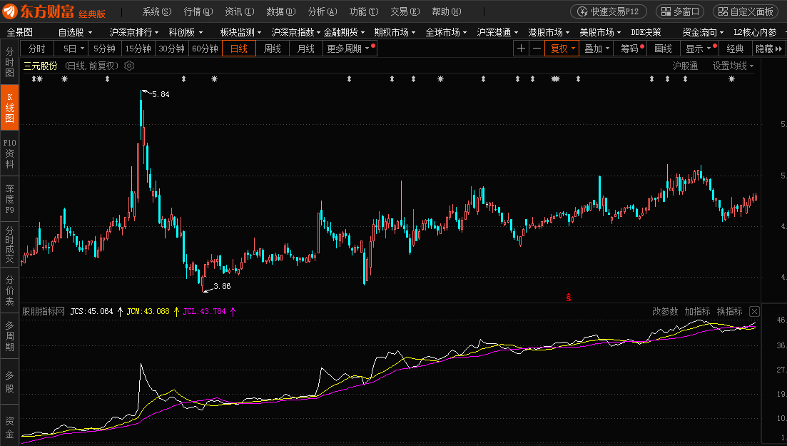 白线为短期主力运作轨迹,黄线为中期主力运作轨迹,紫线为长期主力运作轨迹。