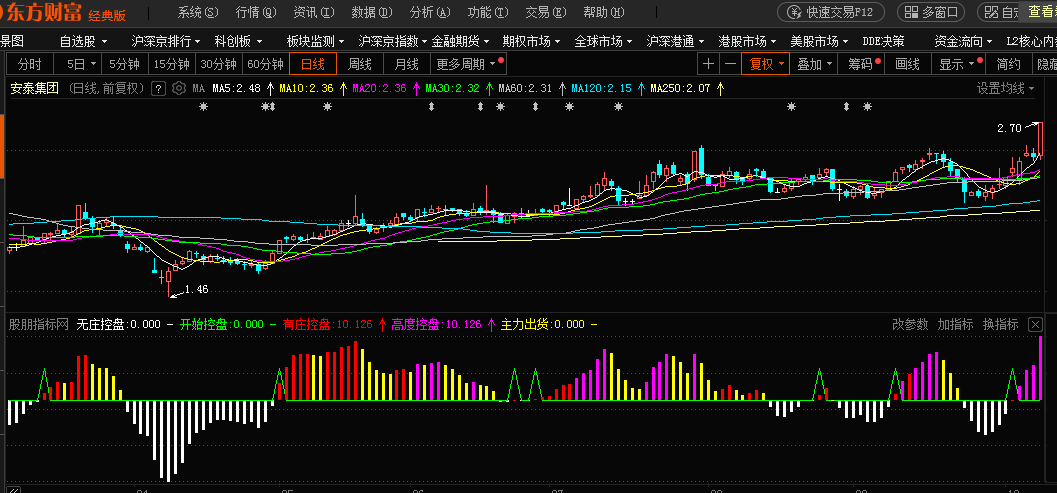 高度控盘:IF(VAR2>50 AND COST(85)<CLOSE AND 控盘>0,控盘,0),COLORFF00FF,NODRAW;