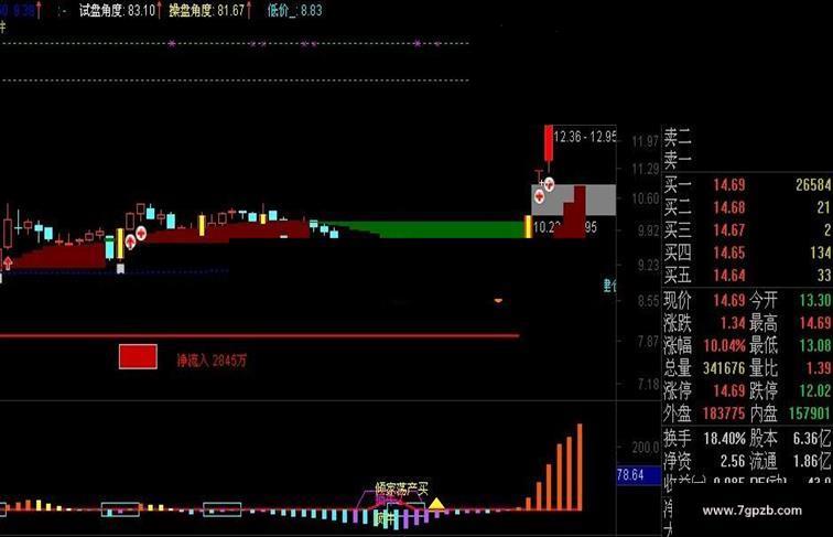 指标中如果出现紫柱跟蓝柱交替,就是空头趋势,此时只要两个柱体交错,我们坚决不拿股票,说明空头趋势已经降临,任何时候,买入股票都是错误的,如果是红色柱体跟黄色柱体交错的话,说明此时股票还是多头趋势,在多头趋势的情况下,我们任何时候持有股票都是正确的。如果在指标当中,出现各个字体标注,如果是疯牛,或者倾家荡产买股票等字眼,说明此时我们应该高度重视,这个时候,很容易变盘,如果出现柱体交换的话,我们就可以买入股票!!但是一定要遵循市场的原则,红色柱体跟黄色柱体消失之后,要毫不犹豫的卖出股票!!此指标的重点就在于通过四个柱体的颜色,我们来判断多空趋势,仅仅是判断多空趋势以及大盘强弱的指标,而非买卖点的指标
