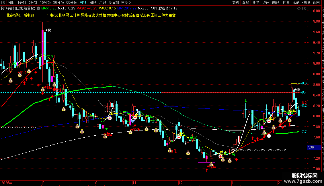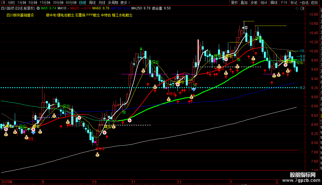 1. 多周期均线系统:显示5、10、25、60、120、250日等关键均线,并标注其数值。均线向上时线条加粗变色,直观显示趋势方向。