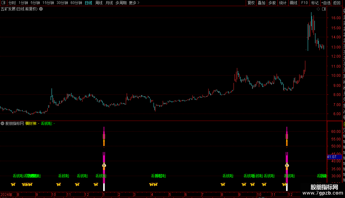 “元宝/丢钱啦”信号:在“财宝”的背景下,当快速随机指标(J11)在低位形成特定形态(X)并开始拐头向上时触发。该信号会标记为“丢钱啦”文字和图标,提示可能的转折点。