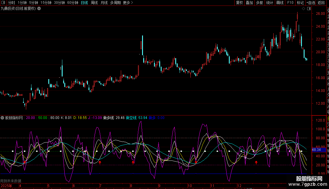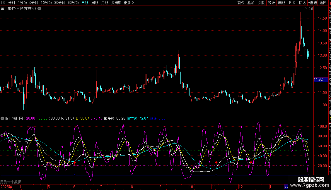 3. 动量确认:整合了标准的KDJ指标(K、D、J线),用于衡量价格动量和寻找背离。