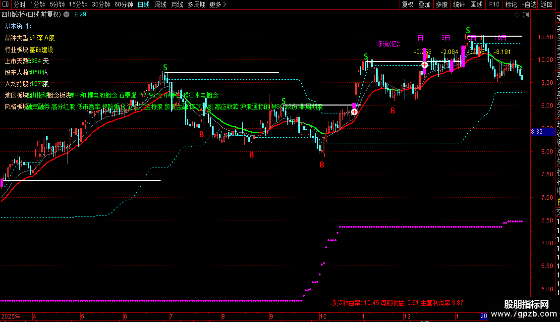 1. 基本面信息面板:在K线图左上角固定显示股票的关键基本面数据,包括品种类型、所属行业、上市天数、股东人数、人均持股、地区板块、概念板块和风格板块。右上角显示净资产收益率、每股收益等财务指标。