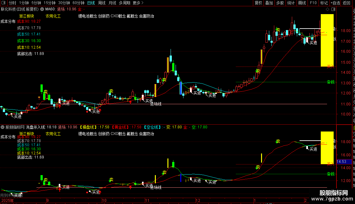 黄金线与空仓线:根据“重心”价格(一种加权平均价)与“操盘线”的相对位置进行染色。当重心在操盘线上方时,操盘线显示为红色(黄金线),表示可持仓区域;反之显示为青色(空仓线),提示空仓或谨慎区域。