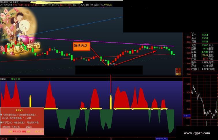 【特别提示】这里要提醒各位注意:任何公式反映的都只是编写人的一个思路,想要用一个简单的公式就涵盖整个股票市场的风云变化,从而一劳永逸,那只能是你的一厢情愿!迄今为止,世界上找不到一个放之四海而皆准的公式!因此,切忌照搬照抄。怎样因人、因时、因势从而巧妙、有效的运用公式就要看你的操作水平及操盘技巧了。