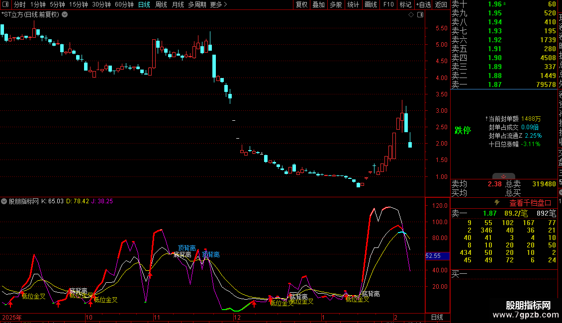 4. 超买超卖警示:对J值、K值、D值进入极端区域(如J<0, J>90, K>90, D>85)进行高亮显示,警示风险或机会。