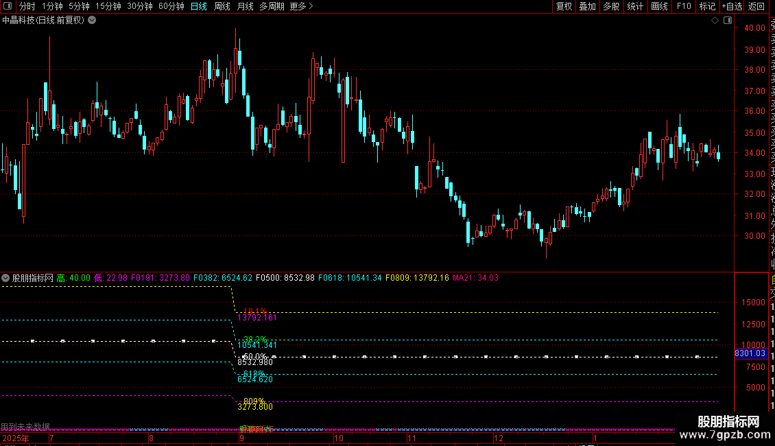 2. 黄金分割线:以识别出的波段高、低点为基准,绘制出19.1%、38.2%、50%、61.8%、80.9%等多条黄金分割位水平线,用于判断潜在的支撑与阻力。