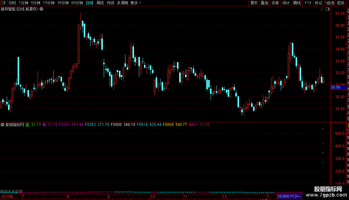 4. 辅助均线:叠加了21日均线(可视作布林带中轨),并用颜色变化(品红/青色)直观显示其短期趋势(走平或向下)。