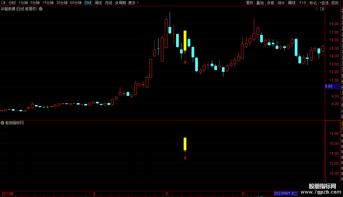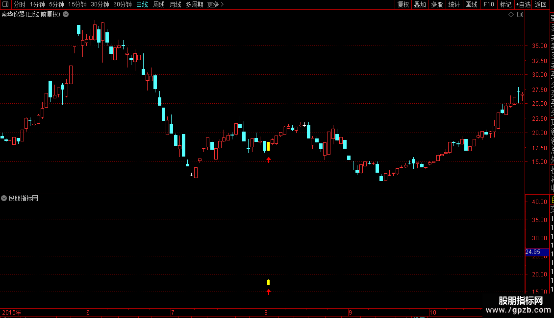 副图指标:加载后,当出现黄色高亮K线及底部图标时,提示关注。