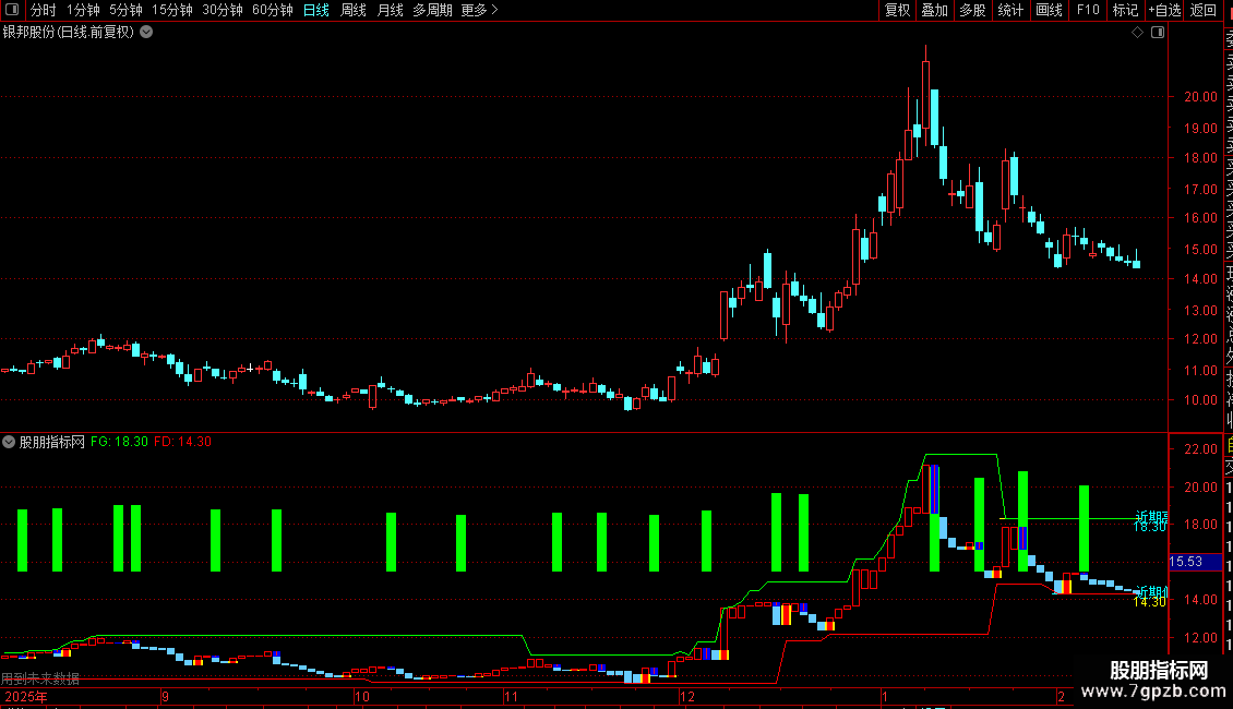 3. 绘制支撑与阻力线:通过`PEAK`和`TROUGH`函数,绘制基于前期高点的绿色阻力线(FG)和基于前期低点的红色支撑线(FD)。