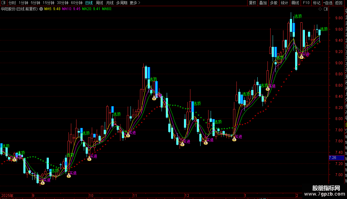 2. 20日均线参考与标记:计算20日简单移动平均线(MMM)。当收盘价高于此均线时,在均线位置用蓝色“”标记;低于时用绿色“”标记,直观显示价格相对于中期均线的位置。