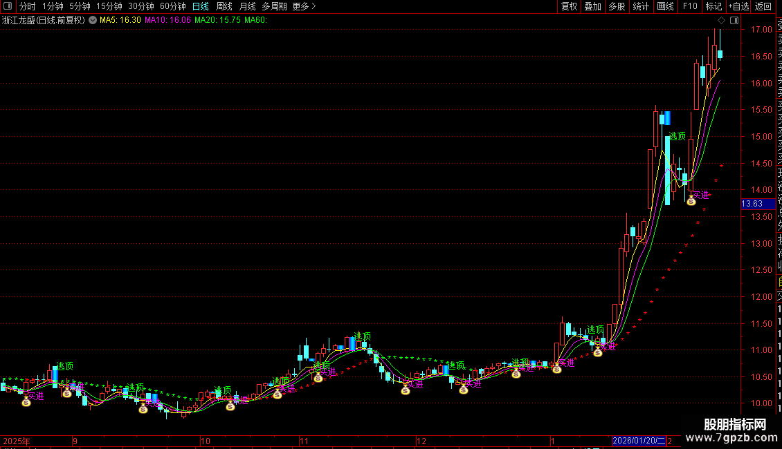 “逃顶”信号:通过另一组条件组合(VARD至VAR1A),识别出潜在的顶部反转或下跌启动形态。当条件满足时,在K线高点附近显示“逃顶”文字。