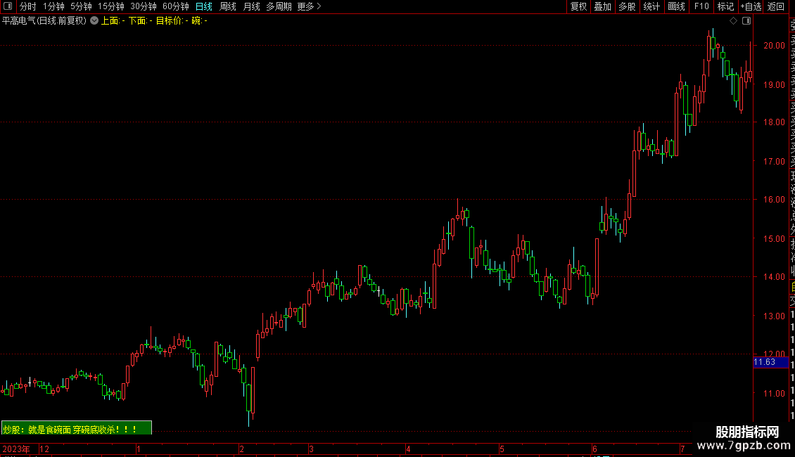KQ1:DRAWTEXT_FIX(C>0,0.00,10,0,' 炒股:就是食碗面 穿碗底收杀!!!')COLORYELLOW;