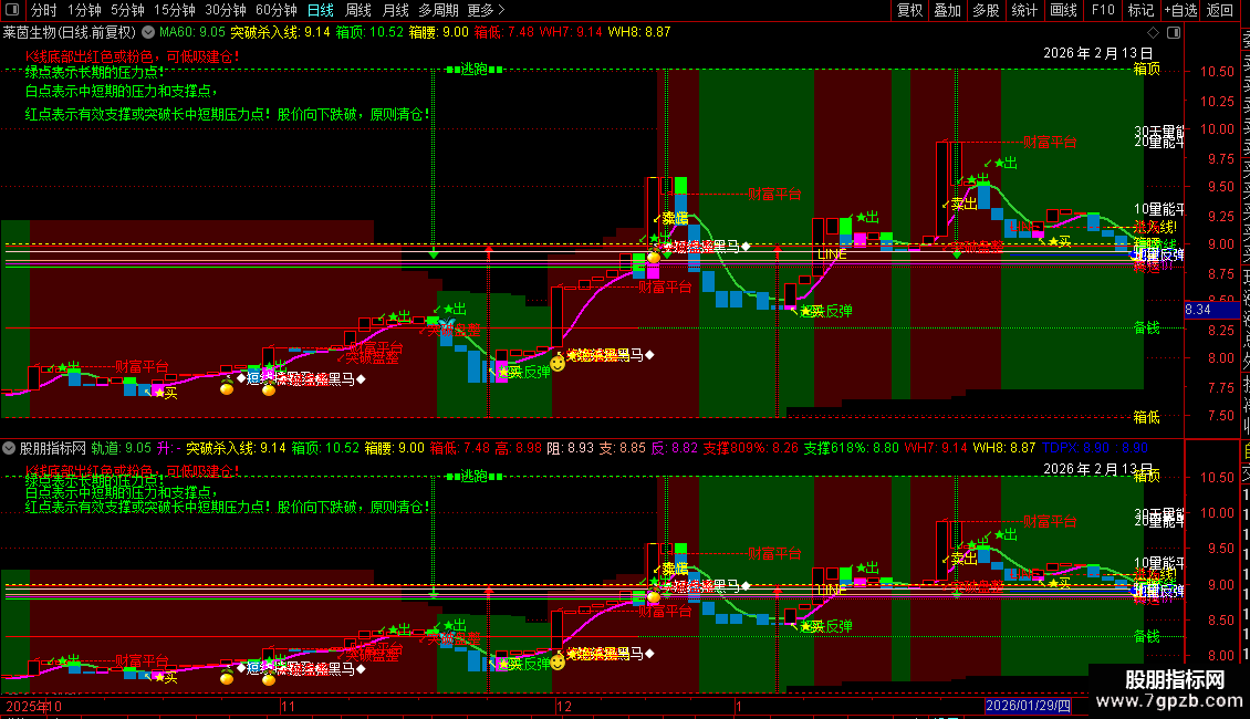 8. 多空提示:在图上固定位置显示指标的使用说明文本。