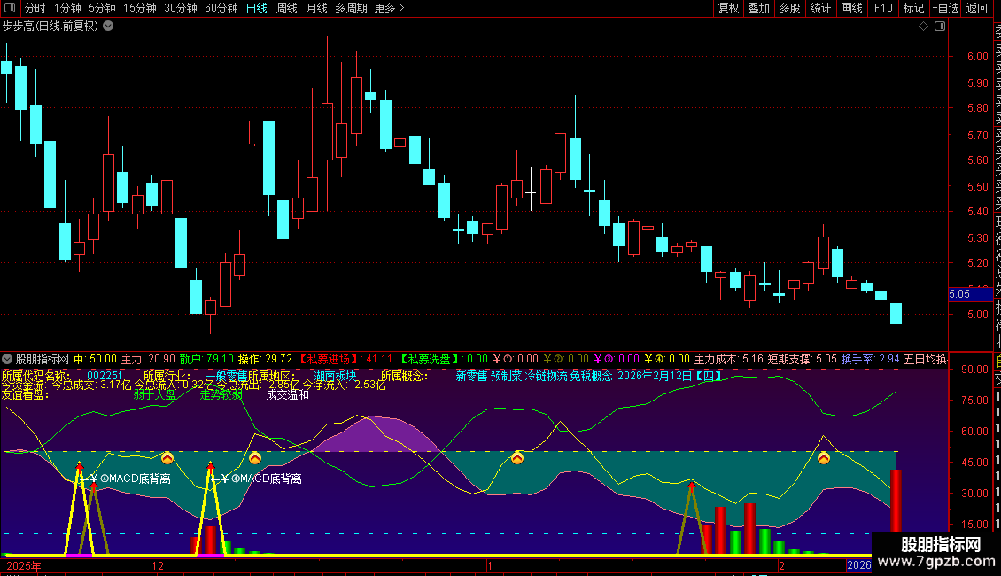 4. 多重买入信号:公式内置了多个独立的买入条件(标注为`¥①`、`¥②`、`¥③`、`¥④`),当条件满足时,会在K线图对应位置显示高亮的信号点和文字说明(如“MACD底背离”)。