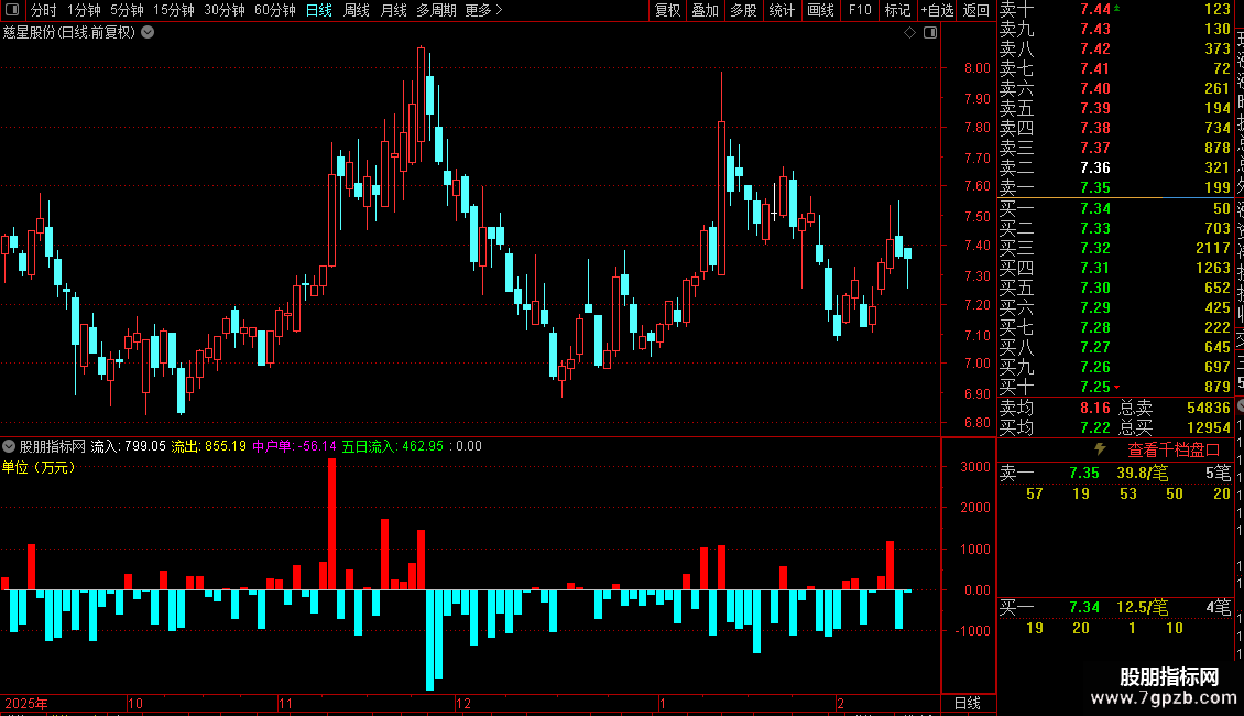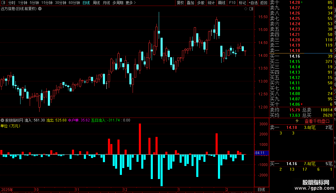 1. 资金流向:利用Level-2数据计算中户单资金净流入(万元),并以红绿柱线直观显示。