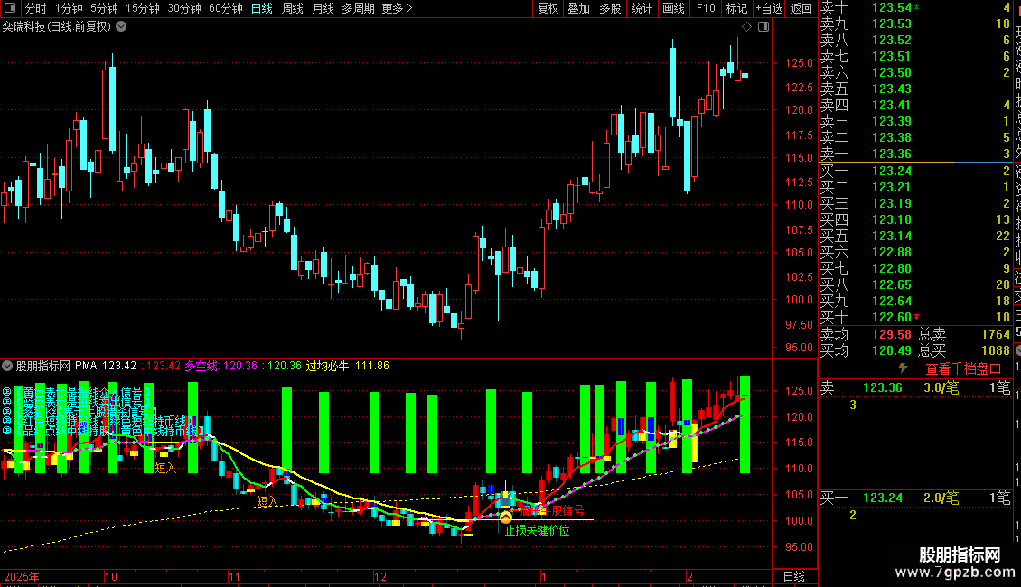计算并显示一条“多空线”,作为中期趋势参考,变色提示方向。