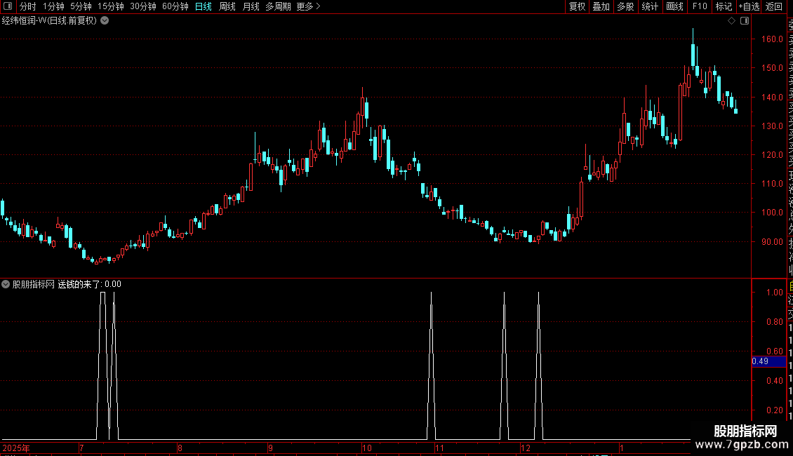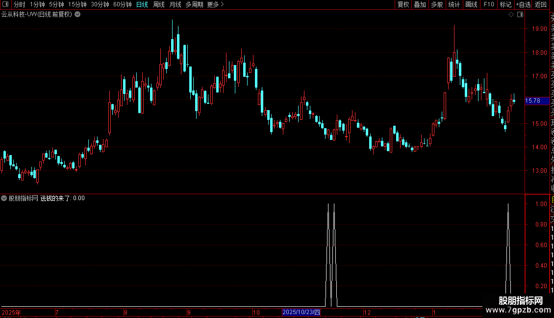 指标用于识别潜在的买入信号,命名为“送钱的来了”。它通过两组条件组合判断: