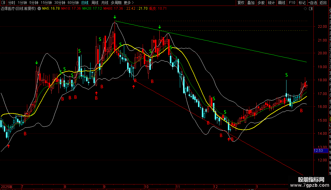 通过“顶”和“底”线构成BBI布林通道,标识价格波动范围。